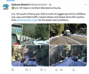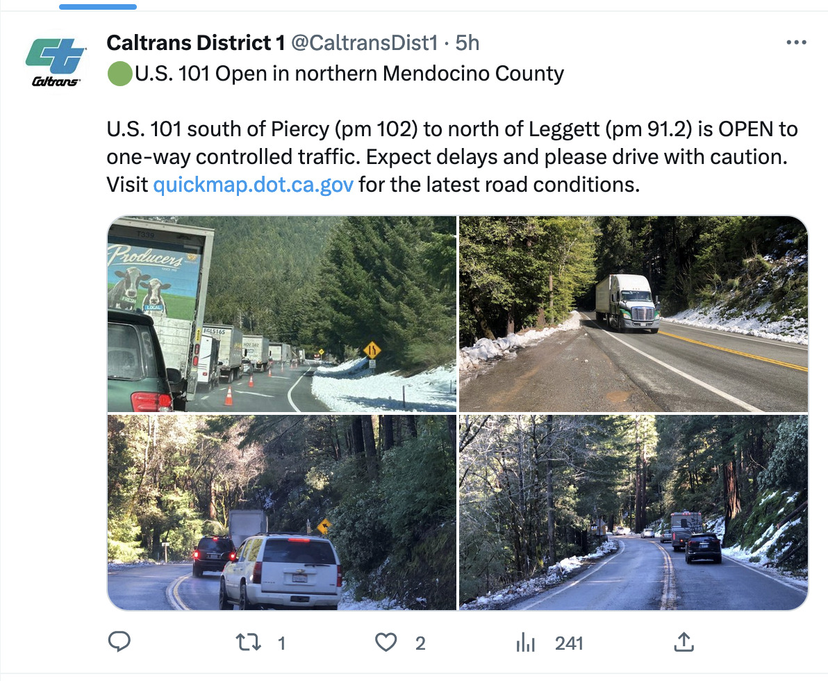Interessant war auch, dass die Kommunikation der staatlichen Straßenwartungsbehörden ausschließlich über Twitter und Facebook erfolgte. Wir schrieben uns auf der Facebook-Gruppe für Shelter Cove ein und dort berichteten Waghalsige von ihren abenteuerlichen und gescheiterten Überquerungsversuchen auf dem Pass zurück zum Highway 101. "Caltrans", die bundesstaatliche Behörde für Straßenverkehr in Kalifornien, berichtete auf Twitter mit Fotos über die Sperrungen des 101 und empfahl, die Lage zu beobachten und abzuwarten.