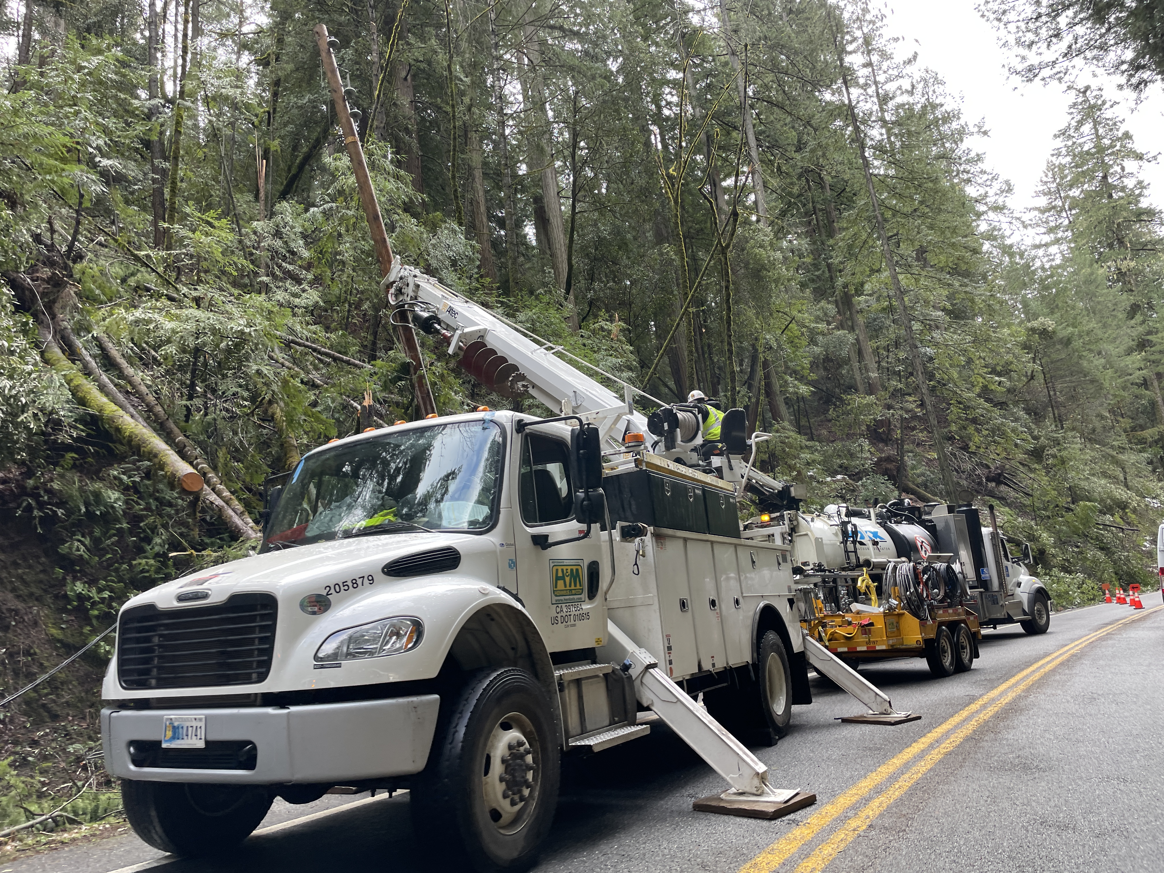 Als wir nach einer Woche Urlaub wieder heimfahren wollten, kam das nächste Problem: Zwar war die Verbindung von Shelter Cove zum Haupt-Highway 101 nun zeitweise wieder offen, aber auf dem Haupt-Highway 101, der einzigen Verbindung Richtung Süden, führten ein paar umgestürzte Bäume, Strommasten und deswegen quergestellte LKWs zu einer Totalsperrung Richtung Süden. Tagelang konnte man aus dem Norden nicht mehr runter in die San Francisco Bay Area fahren, außer man war gewillt, Schneeketten anzulegen und über abenteuerliche kleine Gebirgspässe rüber nach Osten zum I-5 zu zuckeln, was die 4-Stunden-Tour auf acht Stunden verlängert hätte.