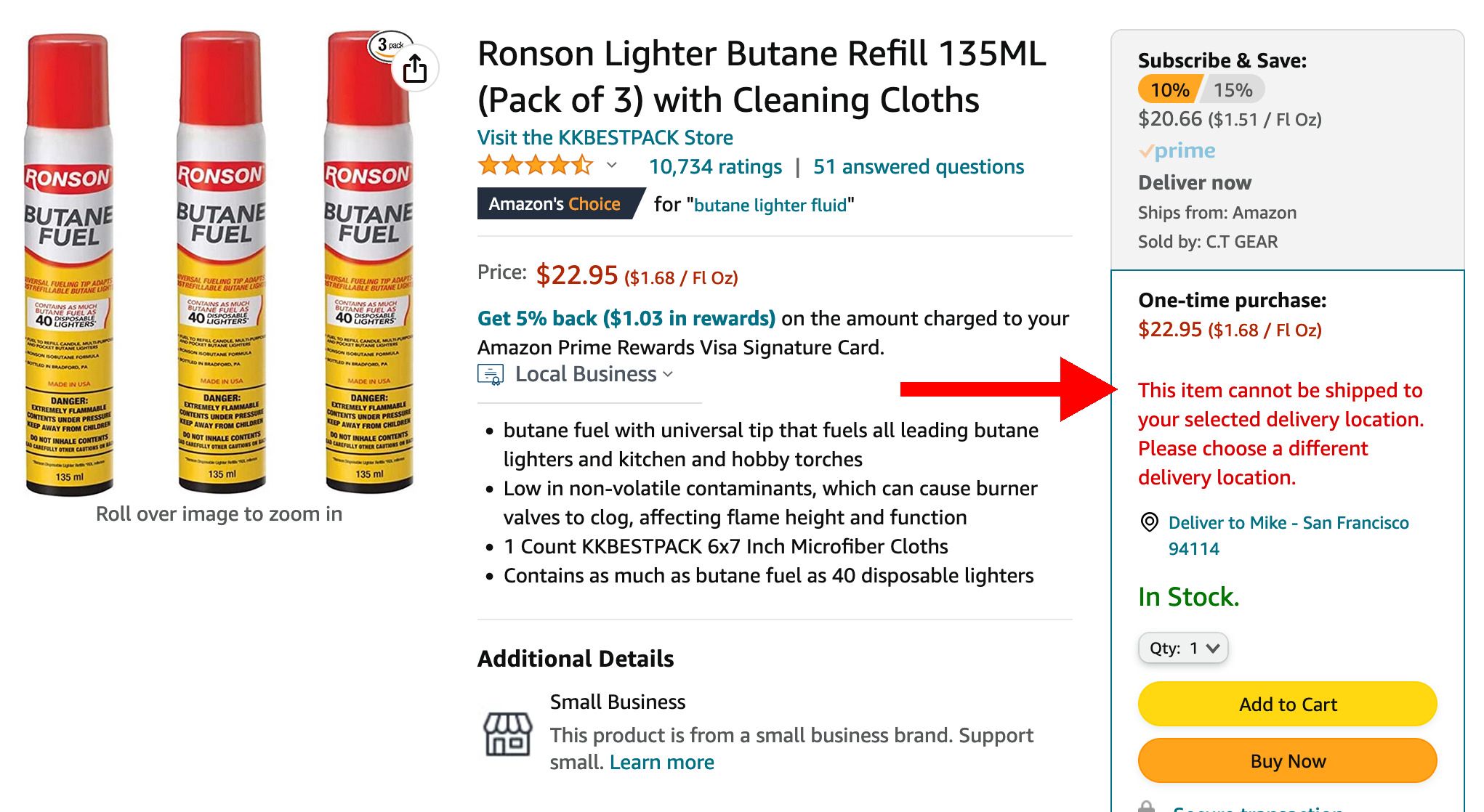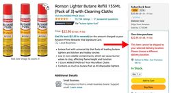 Ein weiteres Aha-Erlebnis ist der Verkauf von Feuerzeugbenzin, sogenanntem Butan. Vor vier Jahren kam der übereifrige Politiker Grayson auf die Idee, ein Gesetz zu entwerfen, nach dem der Verkauf dieses Brennstoffs in Kalfornien zu regulieren sei -- angeblich nutzten viele Haschölproduzenten ihn zur illegalen Fabrikation ihrer Hippieprodukte. Das Gesetz wurde prompt mit einigen Änderungen (Grayson wollte auch noch eine Datenbank mit allen verkauften Butan-Fläschchen anlegen, das wurde aber abgelehnt) vom kalifornischen Senat angenommen und Gouverneur Newsom setzte seinen Fidibus darunter. Zwar schließt der Gesetzestext Nachfülldosen für Feuerzeuge und meinem Crème-brûlée-Brenner explizit von den Restriktionen aus, aber Amazon weigert sich (Abbildung 3) beharrlich, Nachfülldosen an unsere Adresse in San Francisco zu liefern. Auch muss man extrem lange suchen, bis man mal ein Flascherl im Supermarkt findet.