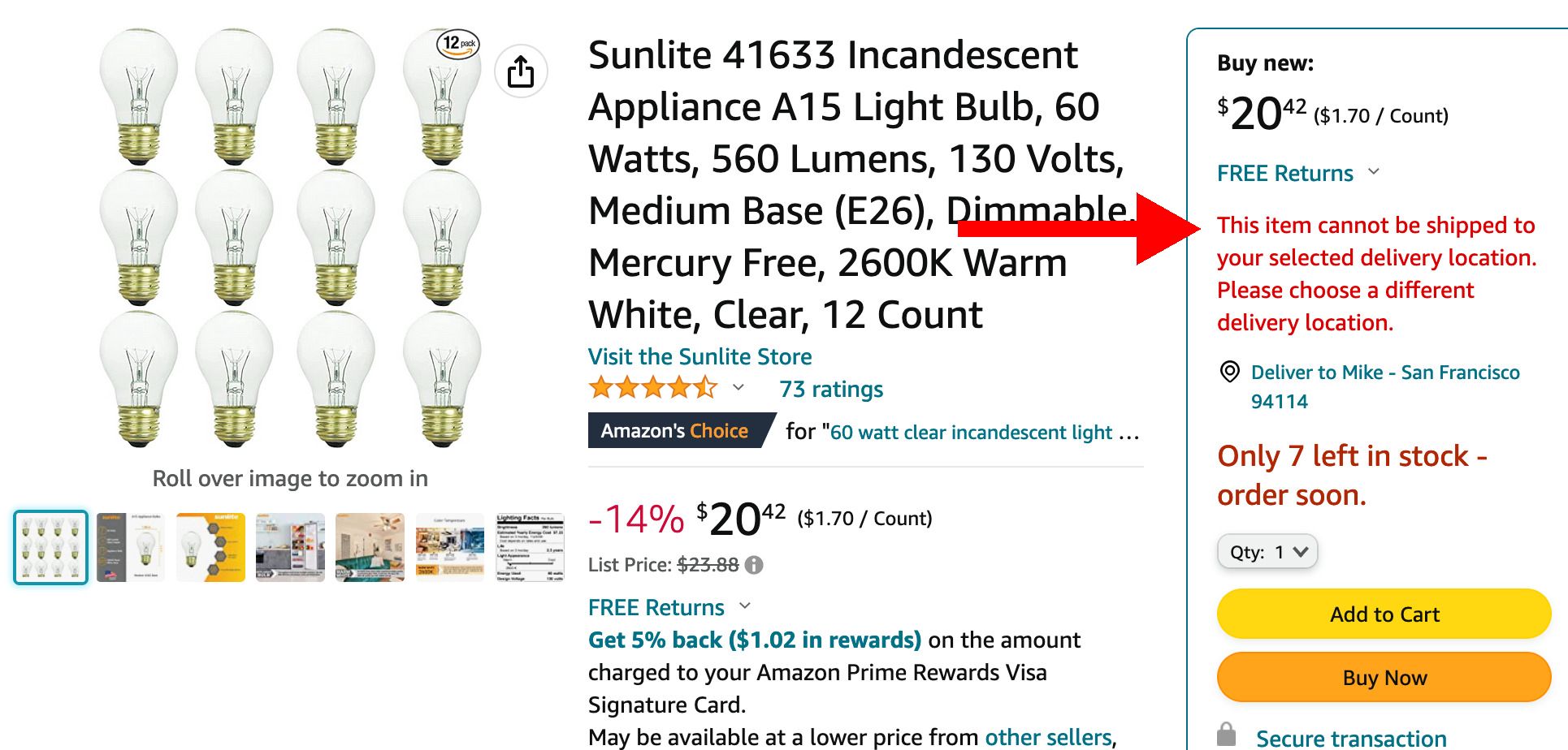 Ähnliches gilt für altmodische Glühlampen: Wie ihr in Abbildung 2 seht, liefert Amazon diese zwar gerne nach weniger restriktiven Bundesstaaten wie Kentucky aus, aber eben nicht nach Kalifornien.