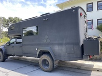 The chassis of the vehicle consists of the most popular American monster truck, the Ford F-550, of course off-road capable with hydraulics, including a classic engine winch in the front, if it gets tough. And of course you can't skimp on the interior. In a Demo-Video for the Earth-Roamer on Youtube the layman can marvel at the dining table set featuring distressed leather seats and extremely solid looking cupboards made from expensive wood.