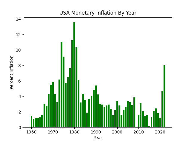 Looking at a table of official US inflation rates by year, it appears that 2023 had the highest recent rate at 8%, similar to Europe where it was 9.2% in 2023. It also shows that the US had even higher rates in the 80s, around 14%, and that was for several years.
