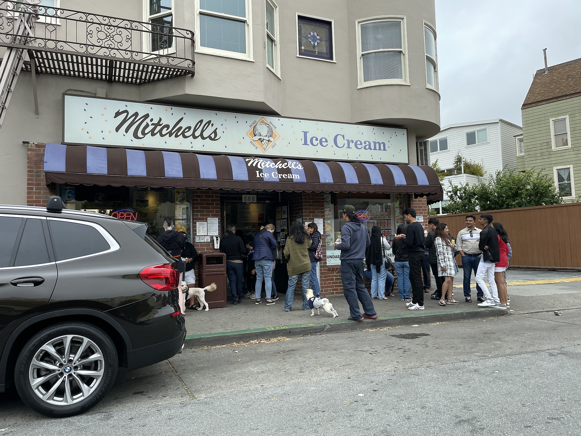 Bei uns in San Francisco ist ein alteingesessener Laden namens "Mitchell's", und vor dem stehen bei schönem Wetter die Leute tatsächlich zwanzig Minuten schlange, um für schlappe fünf Dollar eine Eiskugel abzuholen. Auf einer Waffel kostet's dann nochmal 75 Cent mehr, und die Sales Tax schlägt dann nochmal mit fast 10% zu buche. Außerdem lechzen die Verkäufer nach Trinkgeld wie Kamele nach Wasser in der Wüste. Dabei ist das kein Schicki-Laden, die Kundschaft besteht hauptsächlich aus Arbeitervolk, und man muss sich schon fragen, wie bekloppt man sein muss, ein Drittel seines Stundenlohnes für eine Kugel Eis auszugeben.