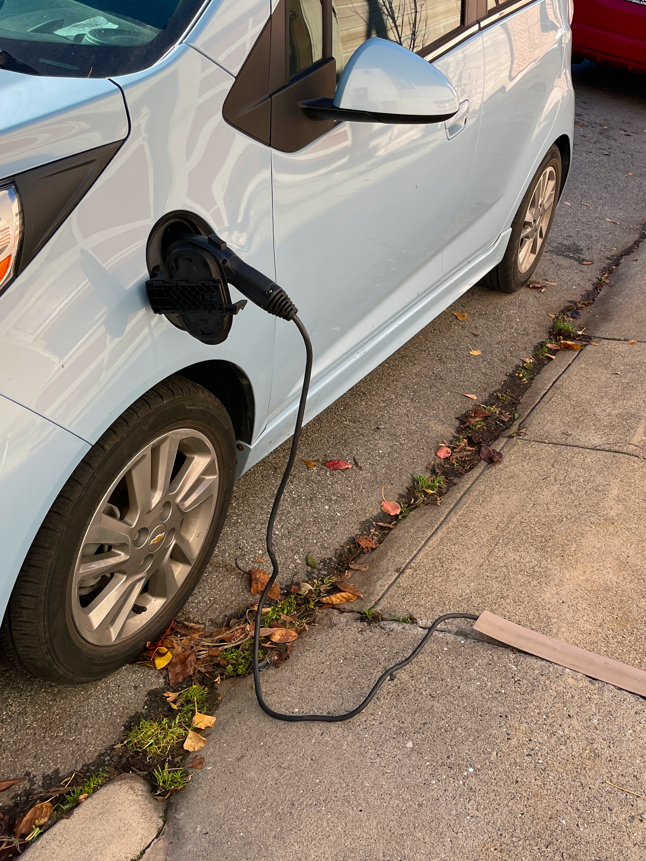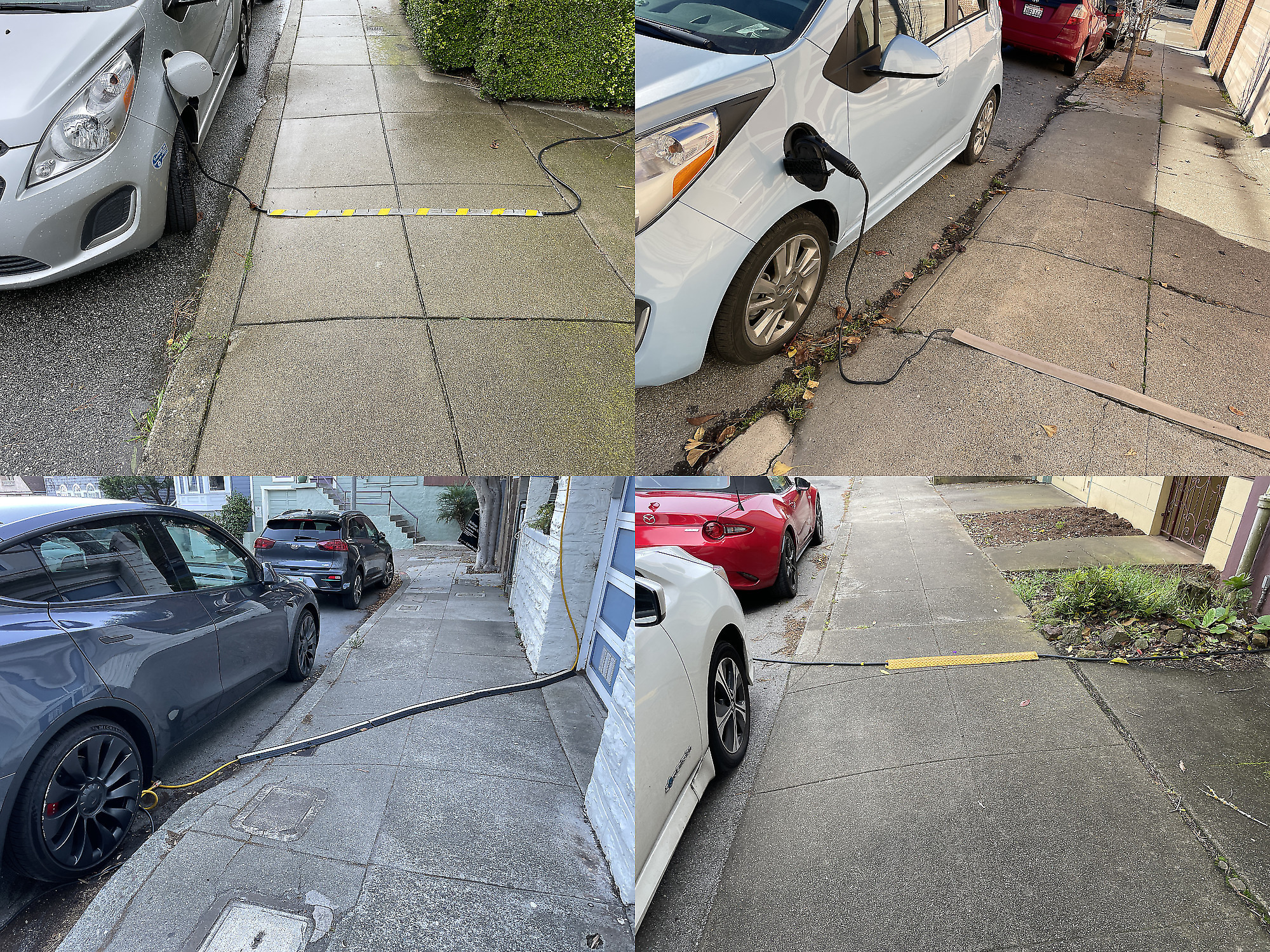 So sieht man als Spaziergänger oft atemraubende Elektroinstallationen, bei denen ein Kabel aus dem Haus zu einem auf der Straße vor der Haustür geparkten Auto führt. Einmal sah ich sogar ein Kabel, das durch ein Fenster im ersten Stock über einen Baum herunter zum Rinnstein führte! Das ist natürlich alles illegal und gefährlich, und die über den Gehsteig drapierten dicken Kabel sorgen bei Rollstuhlfahrern oder Kinderwagenschiebern vielleicht für Verdruß, aber man sieht's überall. Sicher finden die Bürokraten San Franciscos bald einen Weg, diese Elektroautofans kostenpflichtig abzumahnen, auf dass sich das leere Stadtsäckel wieder fülle!