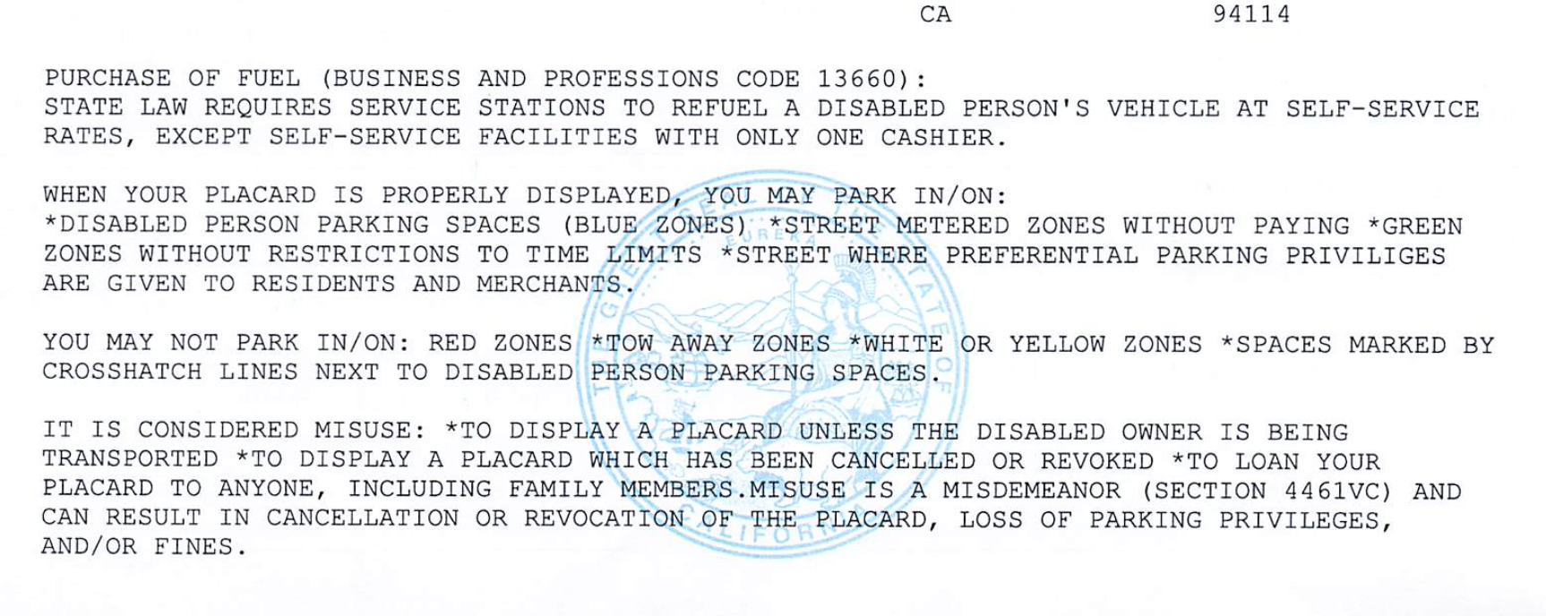 Nach einigen Tagen kam per Email die Bestätigung, dass zur Weiterbearbeitung des Antrags eine Gebühr von 6 Dollar fällig wäre, die ich postwendend online per Kreditkarte entrichtete. Ein paar Tage später kam die Zusage per Email und eine Woche später flatterte ein Brief vom DMV mit der roten Plastikplakette in Abbildung 3 ins Haus. Mit dabei lag die offiziell abgestempelte Urkunde aus Abbildung 4, die man im Geldbeutel mitführen muss, wenn man die Plakette an den Rückspiegel hängt und an sonst eingeschränkten Stellen parkt.