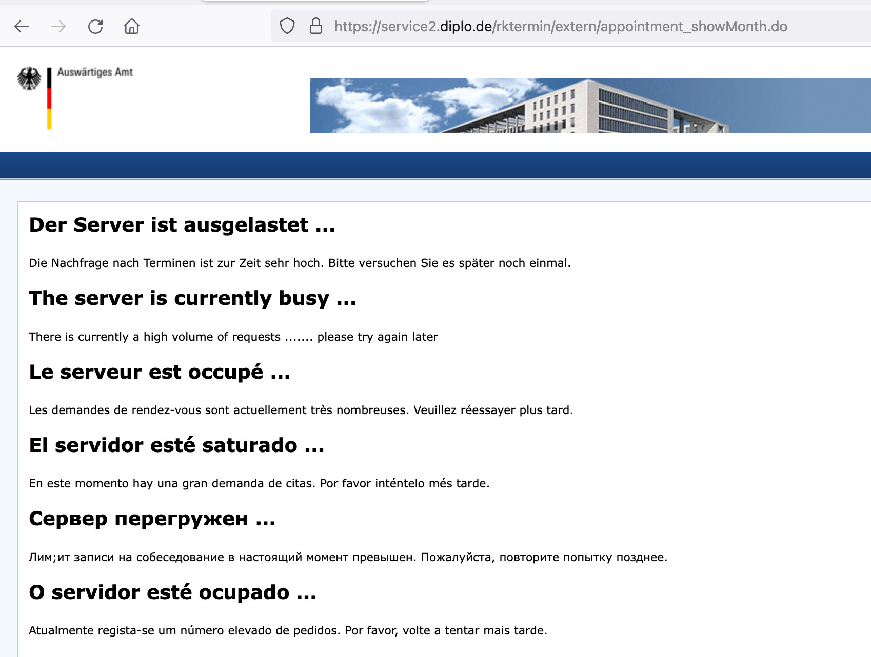 Gibt man nicht gleich auf, sind wenige Minuten später alle Termine für den Tag ausgebucht (Abbildung 4) und der Staatsbürger muss sein Glück am nächsten Tag punkt Mitternacht deutscher Zeit erneut versuchen. Eilig darf man's dabei nicht haben. Laut Konsulatsauskunft kann man aber Härtefälle per Email einreichen, und wenn man die Dringlichkeit des Termins erfolgreich begründet, wird man angeblich irgendwie reingeschoben.