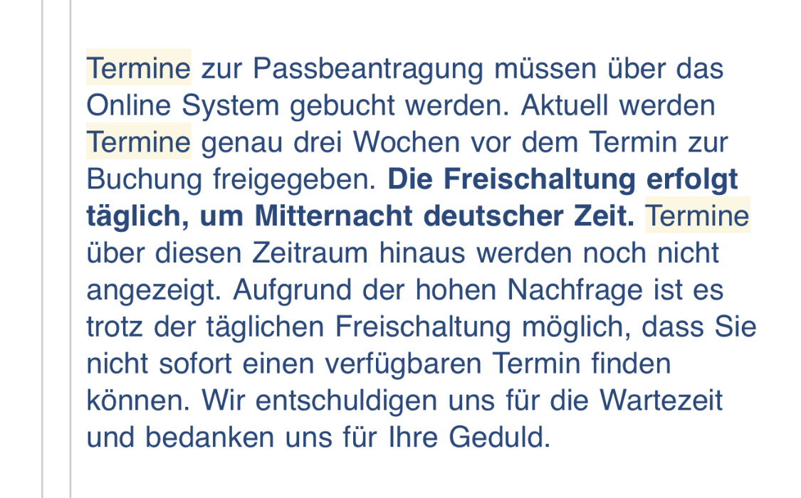 Wer mit viel Glück und flinken Fingern das Online-Formular samt bot-abwehrendem Captcha, das nur Menschen mit Adleraugen überhaupt lesen können, schneller ausfüllt als der Rest der passhungrigen Meute, bekommt einen Termin zugewiesen. Zu diesem darf er dann mit seinem zu erneuernden Reisepass und einer Latte weiterer Dokumente, unter anderem einer Geburts- und Heiratsurkunde, samt Fotokopien drei Wochen später zur vereinbarten Uhrzeit am Konsulat vorbeischauen. Verlängern kann man den alten Pass nicht, statt dessen muss man einen neuen beantragen. Das Konsulat darf die Daten auch nicht speichern, also muss man jedes Mal wieder die ganze Litanei an Dokumenten im Original mit Kopien mitbringen.