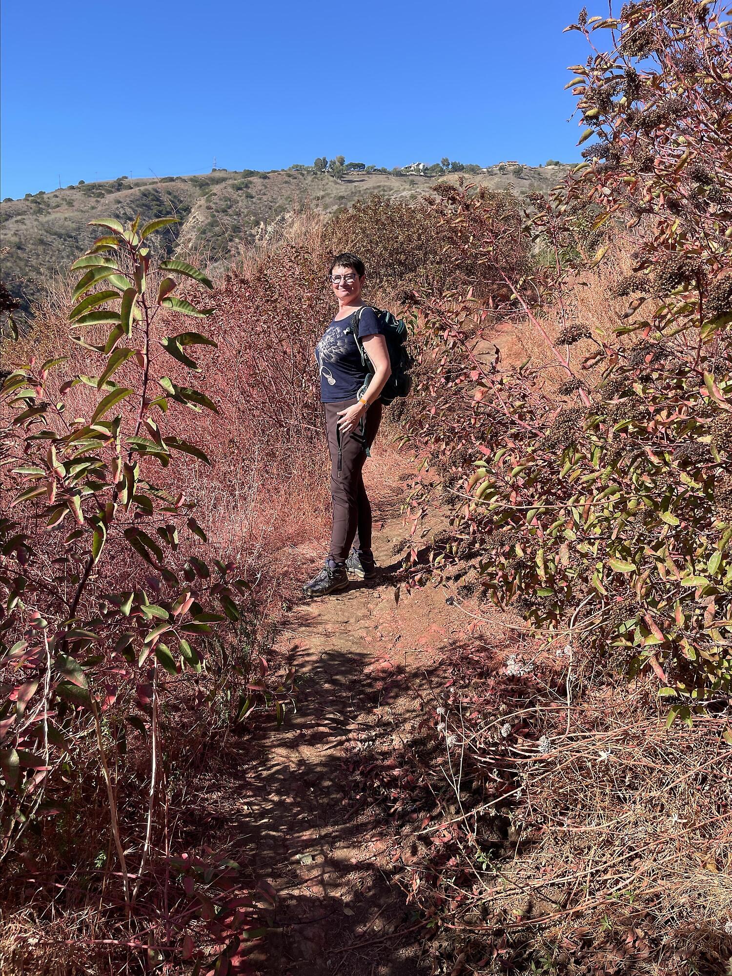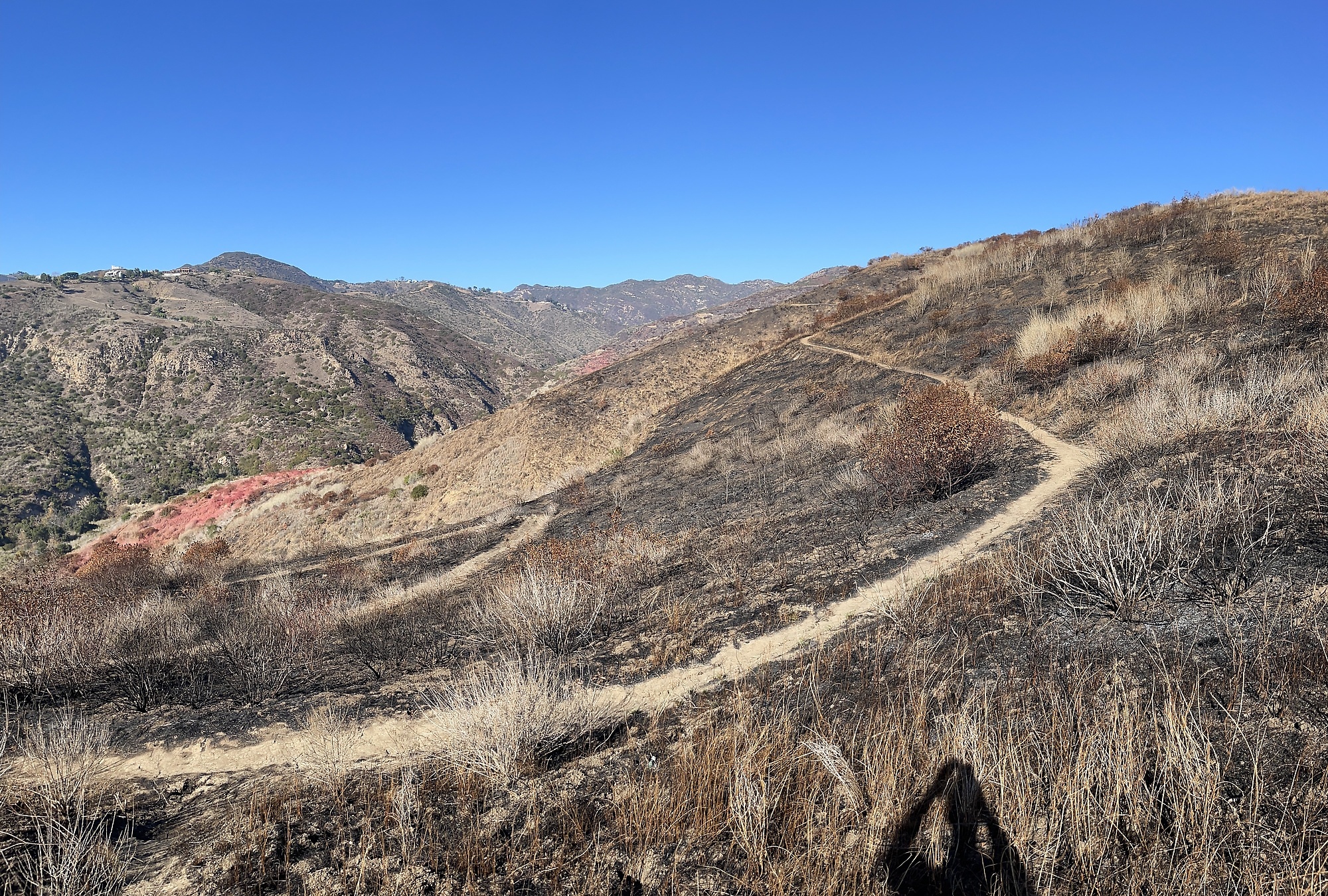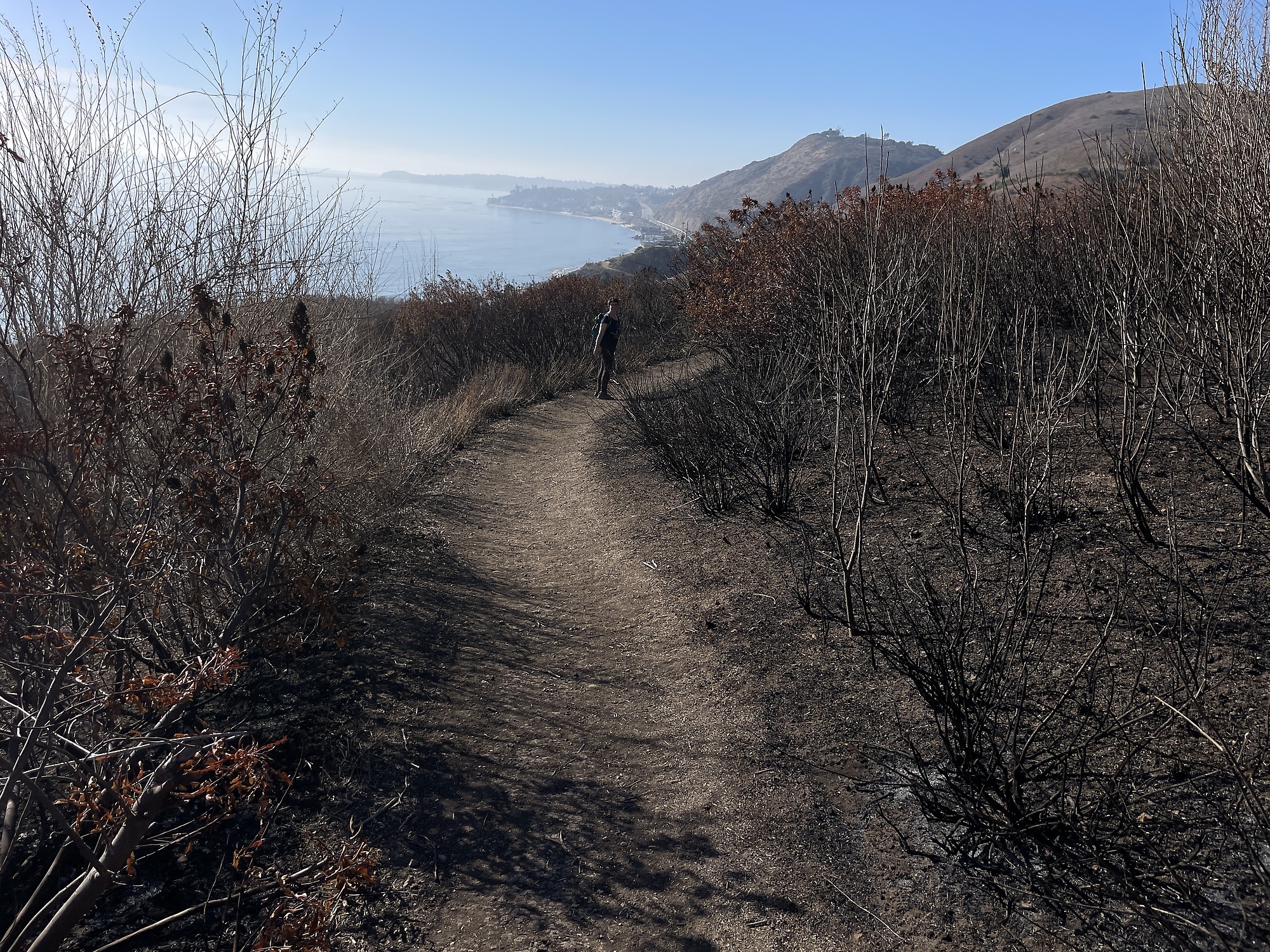 Und ein paar Tage vorher, an einem extrem sonnigen, fast schon heißen Tag (im Januar) hatten wir uns auf einen Wanderweg begeben, der durch den Corral Canyon bei Malibu auf die Hügel hinauf führte. Wir bestaunten die Gegend, die nur aus abgebrannten Büschen bestand, denn dort hatte schon vor einigen Monaten ein Waldbrand getobt.
