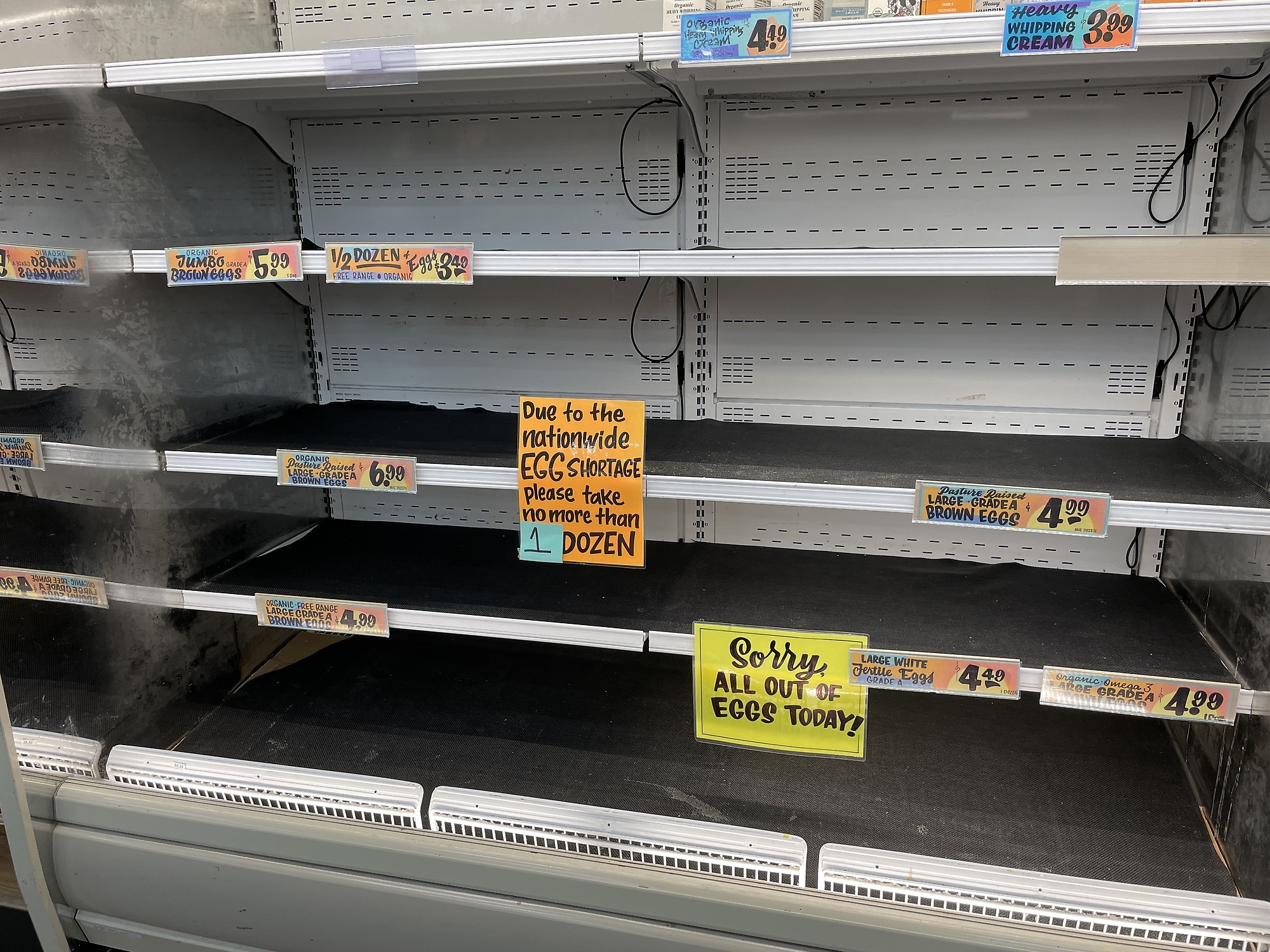 Aber warum sind hier in den USA die Eier knapp? Ein Ausbruch der Vogelgrippe ist der primäre Grund. Viele Hühner mussten gekeult werden, da sie den Virus in sich trugen. Weniger eierlegende Hühner produzieren nun leider weniger Eier für den Verkauf. Hühnerfarmen in den USA haben oft eine stattliche Größe, von bis zu einer Million Hühner pro Farm. Bricht die Vogelgrippe aus, müssen in der Regel aber alle Hühner getötet werden, um eine weitere Ausbreitung des Virus zu verhindern.