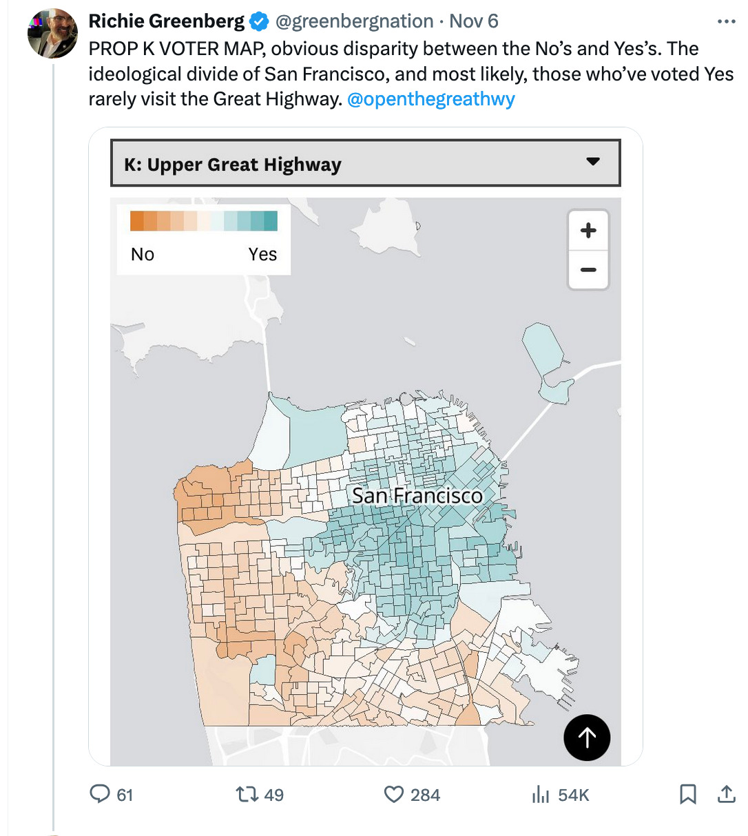Das nennt man auf Englisch eine "Win-Win-Situation". Damit hätte das Thema ad acta gelegt werden können, aber halt stopp, das wäre ja zu einfach. Denn der ausgearbeitete Kompromiss war als Pilotprojekt befristet und sollte Ende 2025 auslaufen. Die Stadt wollte Daten sammeln, um zu sehen, wie stark das gesperrte Teilstück von Fußgängern und Fahrradfahrern genutzt wird, und was die Auswirkungen auf die Verkehrsströme sind. Keine Ahnung warum das Datensammeln über vier Jahre dauerte, aber dergleichen ist in dieser Stadt nicht ungewöhnlich. Anstatt nun aber die Daten gescheit auszuwerten und dann im Stadtrat zu beschließen, ob das Pilotprojekt so weiter geführt werden kann oder Veränderungen vorzunehmen sind, fiel man lieber auf die bewährte Methode der Wählerabstimmung durch die sogenannte Proposition (grob übersetzt als Volksbegehren) zurück. Fünf städtische Abgeordnete und unsere damalige Bürgermeisterin London Breed sorgten dafür, dass die Proposition K auf unserem Wahlzettel im November 2024 stand, zeitgleich mit der Bürgermeisterwahl in dieser Stadt, und deshalb war mit einer hohen Wahlbeteiligung zu rechnen.