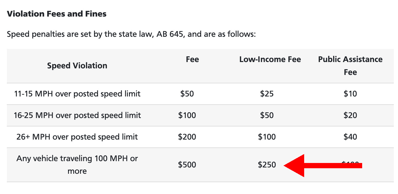 Das Ganze hat natürlich den Haken, dass rasende Kriminelle mit gestohlenen Autos gar nichts zahlen. Und, typisch für San Francisco, gilt Zwei-Klassen-Recht: Normalverdiener werden doppelt so hart bestraft wie arme Leute, denn rasende Geringverdiener bekommen offiziell 50% Nachlass (Abbildung 14).