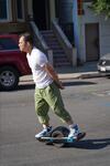 Und schließlich gibt es noch die von mir so genannten "Selbstmordmaschinen", e-motorisierte Einräder, entweder als Board auf fetter Gummiwalze oder einem klappradgroßen Reifen, durch dessen Nabe eine Stange geht, mit zwei Fußrasten links und rechts. Darauf steht der Fahrer, und wie bei einem Segway balanciert sich das Gerät eigenständig, während der Fahrer es durch Vorlehnen vorwärts bugsiert oder durch Zurücklehnen abbremst.