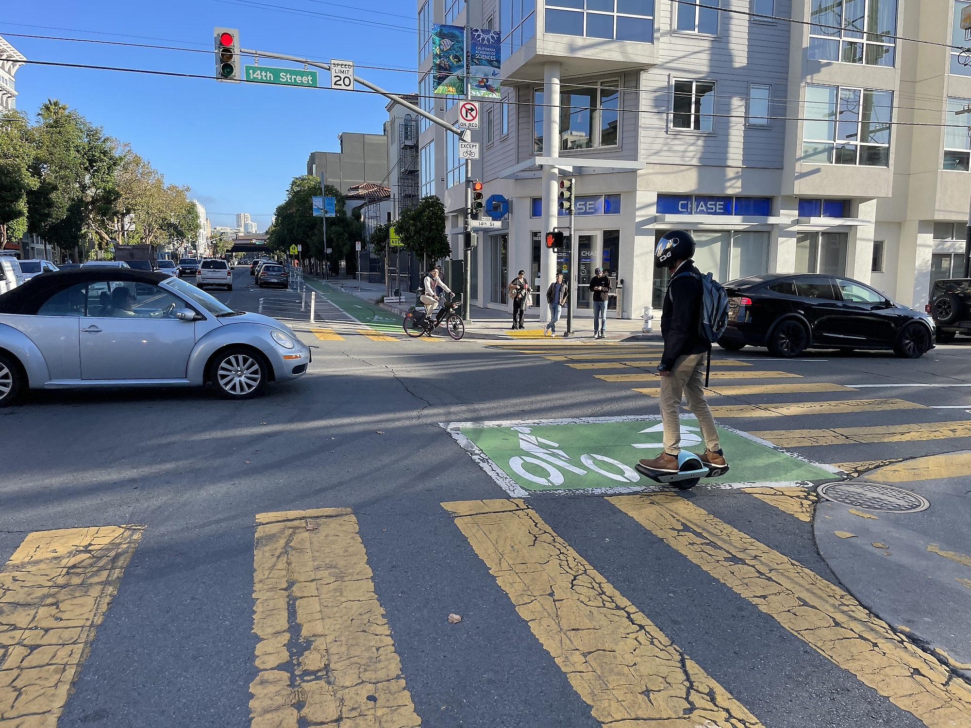 Das Problem ist nicht das Rad an sich, denn Fahrradfahrer überleben ja auch im Stadtverkehr, sondern die extreme Geschwindigkeit dieser Fahrzeuge. Legal ist die Raserei nicht, die zulässige Höchstgeschwindigkeit liegt in Kalifornien bei 15 mph (24km/h). Dennoch gibt es auch hier in San Francisco Läden, die aufgemotzte Geschosse verkaufen, die doppelt so schnell fahren.