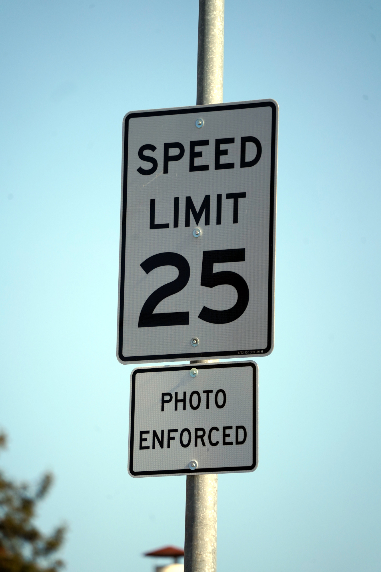 Damit es keinem ertappten Autofahrer einfällt, gegen die Radarfallen zu klagen, stehen einige Meter vor den Kameras jeweils große Schilder mit der zulässigen Höchstgeschwindigkeit sowie dem Verweis "Photo Enforced" (Abbildung 13).