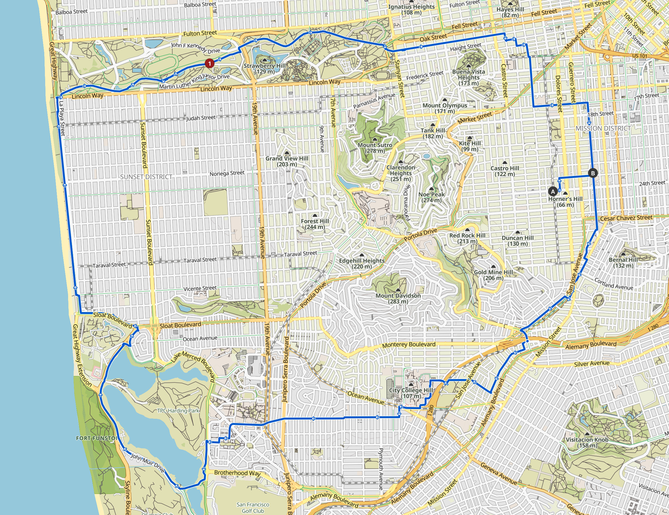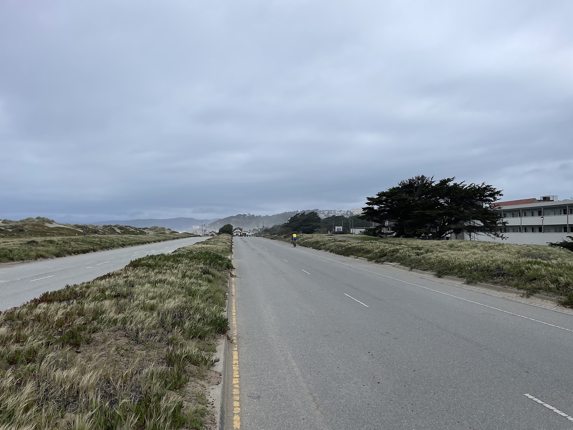 Jedenfalls hat Michael, ein begeisterter Fahrradfahrer, einen Rundweg von unserem Zuhause in Noe Valley bis zum Great Highway ausbaldowert. Die Strecke führt erst untenrum durch den Stadtteil Glen Park, dann durch's City College, durch den Campus der Universität San Francisco, dann auf dem Highway entlang, um durch den Golden Gate Park und den sogenannten "Wiggle" wieder durch die Mission nach Noe Valley zurückzukehren. Dauert circa zwei Stunden.
