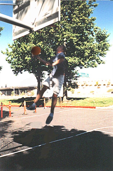 Auch nehme ich mir mittlerweile jeden Tag eine halbe Stunde Zeit, um endlich gescheit Basketball zu lernen -- einer der Basketball-Courts liegt direkt vor dem Gebäude, in dem ich arbeite, und in meinem Cubicle liegt, seit ich beim Target-Supermarkt einen gekauft habe, stets ein Basketball bereit. Gespielt wird Mann gegen Mann, wie in New-York-Harlem auf der Straße! Es ist unglaublich, wie gut manche Amerikaner Basketball spielen können, ich habe zwar noch keinen gesehen, der einen Slam-Dunk hinlegen konnte (dazu muss man so hoch springen, wie der Korb hängt, und den Ball mit einer Hand reinknallen), aber das Spielniveau ist viel höher als in Europa. Jeder hat zumindest ein paar Tricks auf Lager, und ich kann noch nicht recht viel, aber es wird täglich besser. Das Problem ist nur, dass, wenn ich in der Sommerhitze, und im Silicon Valley hat's im Sommer schon mal 40 Grad, auf dem Basketball-Court rumhetze und danach in mein Cubicle zurückkehre, ich schwitzen muss wie ein Schwein. Neulich kam ich grade von einem anstrengenden Match zurück und gleich darauf kam jemand an meinem Cubicle mit einer Frage an, also setzte ich an, ein technisches Problem zu erläutern, und während ich redete, merkte ich, dass ich brutal anfing zu schwitzen. Es trieb mir richtig die Schweißtropfen aus den Poren raus, und der Kollege begann sich schon zu wundern und mich fragend anzusehen, da er ja nicht wusste, dass ich ja noch Minuten vorher auf dem Sportplatz rumgetobt hatte. Das war dann sehr lustig, als ich erzählte, dass das nicht an seiner Frage gelegen hatte, sondern an der körperlichen Anstrengung. Erst neulich gelang es mir in einer einzigartigen Aktion, einen meiner Kollegen mit 5:4 zu besiegen -- zu seiner Verteidigung muss man sagen, dass er wegen eines wichtigen Projekttermins die Nacht durchgearbeitet und auf einem der bei Netscape herumstehenden Sofas nur zwei Stunden geschlafen hatte -- dennoch: ein Achtungserfolg!