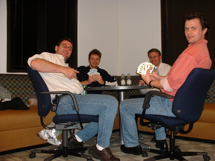 Drei Wochen lang gingen dann die Emails hin und her, immer konnte einer nicht. Dann schließlich, an einem Montag, hatten plötzlich alle Zeit. Nur: "Hardy's Bavaria" hat am Montag zu! Also spielten wir beim Christian zu Hause in Cupertino, für die Fachleute unter euch: Sauspiel 10 Cents, Solo 25, Läufer beim Solo ab drei, beim Wenz ab zwei, jeder darf legen, ohne Farbwenz, mit Stock wenn keiner spielt, Schuss übernimmt. Ein gelungener Abend ... und Christian hat jetzt beim Netscape die Mailing-Liste schafkopf@netscape.com eingerichtet, dort wird ausgemacht, wann die nächste Spielrunde stattfindet, also, falls ihr mal in der Nähe und des Schafkopfspielens mächtig seid, tragt euch ein. Ich kann nur sagen, dass ich so gut wie eh und je spiele, und ich konnte gegen die versierten Kartler, die sogar Augen und (!) Trümpfe mitzählten, gut mithalten, obwohl ich nach wie vor nur "nach Gefühl" spiele. Es geht eben nichts über eine sechsjährige Intensiv-Ausbildung! Ein amerikanischer Kollege bei Netscape fragte mich neulich, wie lange es denn dauere, bis man ein einigermaßen guter Schafkopfspieler werde, und ich erwiderte nach einigem Überlegen, dass dazu schon sieben, acht Jahre kontinuierliches Training erforderlich wären. Entrüstet wandte er sich ab! Keine Geduld, diese Leute. Aber ehrlich, es ist wirklich wahr. Die Regeln lernt man natürlich schneller, aber, um tatsächlich zu gewinnen, braucht's mehr. Viel mehr. Oh, ja. Ha! Ich kann euch sagen ...