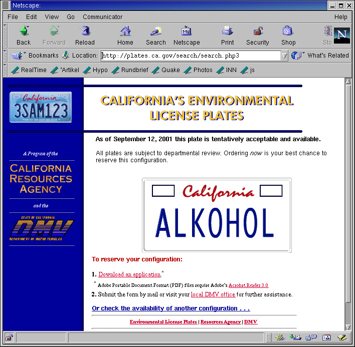 Ich erhielt außerdem einen neuen Kraftfahrzeugschein -- alles muss seine Ordnung haben --, und ging hinaus, um mit einem mitgebrachten Schraubenzieher die neuen Nummernschilder am Auto zu befestigen. Seitdem bin ich der "PERL MAN". Jeder bei Netscape weiß, wer da kommt. Aber noch andere gibt's: Der Chef der Computerwartungsabteilung bei Netscape, der schon länger dabei ist und recht gut verdient hat, fährt übrigens einen Porsche Carrera (kostet hier ungefähr 80.000 Dollar) mit dem Nummernschild "THX AOL" ("Danke, AOL"). Ein ehemaliger Arbeitskollege von mir ist Spezialist in der Programmiersprache Java und fährt "MMM JAVA" in seinem M3er-BMW umeinander. Ja, Spaß muss sein. Wenn ihr rausfinden wollt, welche Nummernschilder in Kalifornien noch erhältlich sind, schaut einfach unter http://plates.ca.gov/search nach. Ihr werdet es sehen -- "PERL MAN" ist weg, da wart ihr zu spät dran!