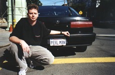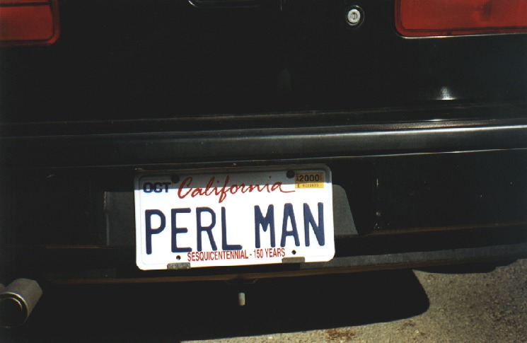 Ich ging zur Internet-Seite der KFZ-Registrierungsstelle Kalifornien und sah nach -- in der Tat war es noch zu haben. Auf dem Internet kann man auch ein Anmeldeformular ausdrucken lassen, das man dann per Post an die zentrale KFZ-Registrierungsstelle in Sacramento/Kalifornien schickt, und kaum vier Wochen später liegt eine Nachricht im Briefkasten, dass man nämlich das Nummernschild von einer KFZ-Meldestelle abholen kann. Ich vereinbarte telefonisch einen Termin, da ich schon wusste, dass man dort sonst immer lange warten muss. Das geht mit einem automatisierten System, mit dem man einen Computer am anderen Ende anweist, einen Termin herauszusuchen. Anschließend bekommt man eine Kontrollnummer, mit der man dann am vorgeschlagenen Zeitpunkt bei der KFZ-Meldestelle aufkreuzt. Der Mann am Schalter brach fast zusammen vor Lachen, als er den Umschlag mit meinen neuen Nummernschildern öffnete, auf denen in großen Lettern "PERL MAN" stand. Er fragte, ob sich das auf die Rock-Gruppe "PEARL JAM" bezöge, und ich klärte ihn darüber auf, dass dies ein Hinweis auf eine Programmiersprache sei.