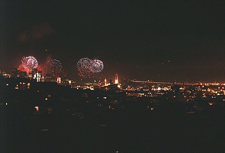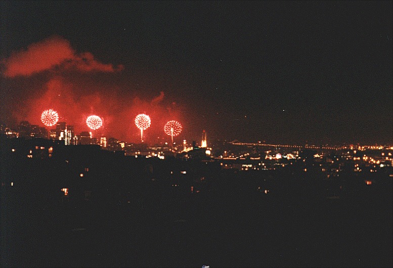 Ist ja wohl klar, dass wir nie aus unserem Apartment ausziehen können, denn der Blick aus unserem Fenster ist einfach unbezahlbar. Witzig war auch, dass um 23 Uhr unser mexikanischer Nachbar mit seiner Tochter und einem Kanister Tequila im Schlepp klingelte, um mit uns anzustoßen. Den Plastikbehälter hatte er im Koffer aus Mexiko geschmuggelt, wo er mit seiner Familie auf Heimaturlaub war. Michael hatte ja erst Bedenken, an dem schwarzgebrannten Schnaps zu erblinden, aber -- wie ihr seht -- haben wir den wunderbar milden Tequila gut überlebt. Am Neujahrstag hatte Michael vormittags Bereitschaft für AOL, d.h. er musste telefonisch erreichbar sein, um sich bei eventuell auftretenden Jahr-2000-Problemen über unseren Heimcomputer in die Firma einzuloggen. Aber, oh Wunder, nichts passierte und keiner brauchte den Oberhacker. Als Ausgleich gab's einen zusätzlichen Tag Urlaub, den wir noch im März für ein verlängertes Wochenende nutzen werden. Hurra!