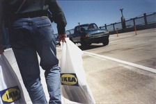 Vor dem Eingang hatte sich eine Menschenschlange gebildet. Um zu verhindern, dass sich die Leute drinnen tottrampelten, wurden die Menschen immer nur in kleinen Pulks vorgelassen und nur wenn welche den Laden verließen, durften neue nachrücken. Die Wartezeit betrug etwa ein bis zwei Stunden -- nur um in den Laden hinein zu gelangen. Das war uns dann doch zu doof und wir fuhren heim, um einige Wochen später, als sich der Wirbel etwas gelegt hatte, wieder zu kommen. Diesmal bekamen wir gerade noch einen Parkplatz, drangen sofort in den Laden vor und schlenderten durch die Gänge. Ikeas sehen ja auf der ganzen Welt gleich aus: Oben sind die Möbel aufgebaut, man sucht sich aus, was man will, um es dann unten abzuholen. Unten angelangt, findet sich statt des ausgesuchten Möbelstücks ein roter Zettel am entsprechenden Regal, der anzeigt, dass das Teil nicht vorrätig ist. Frustiert kauft man einen 100er-Sack Teelichter. Der Ikea in Oakland freilich setzte noch einen drauf: Unten angelangt, sahen wir nur vollständig leergefegte Regale -- ich erinnerte mich an einen Besuch in einem Kaufhaus in Ost-Berlin Mitte der 80er! Frustiert kauften wir zwar keinen 100er-Sack-Teelichter aber ein unnützes Holzkästlein mit viel zu kleinen Schubladen und fuhren heim. Auch die hiesige Presse hat sich schon des Themas "Ikea" angenommen -- in einem Artikel des San Francisco Examiners wurde vorgeschlagen, vor dem Eingang doch einfach Eintrittskarten zu verkaufen, um das ganze wenigstens nach Museumsbesuch aussehen zu lassen, wenn man schon keine Möbel fände.