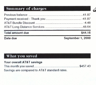 Die Telefonrechnung schlüsselt dann immer genau auf, wieviel man denn durch all die Spezialdeals gespart hat (man kann in X verschiedenen Sparprogrammen zur gleichen Zeit sein, wir sind, glaube ich gerade in zweien eingeschrieben). Bei uns heißt es dann: Ihre Rechnung lautet auf $44.16. Sie haben $457.63 gespart. Kein Scherz, in Abbildung 15 seht ihr eine Kopie der Rechnung! Das waren natürlich Sternstunden der Verhandlungstechnik -- probiert das nicht zu Hause, Kinder, wir sind trainierte Profis!