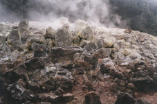In der Ferne sieht man eine riesige Dampfwolke. Das ist genau die Stelle, wo die Lava sich in den Ozean ergießt. Da die Lava ca. 2100 Grad Fahrenheit heiß ist (etwa 1000 Grad Celsius) und auf Seewasser stößt, kann man sich vorstellen, dass es schon recht heftig dampft. Auf halber Strecke unser Wanderung trafen wir dann übrigens auf ein Pärchen, das gerade auf dem Rückweg war -- und wie völlig elektrisiert ob des Erlebnisses wirkte -- und zudem auch noch aus der Nähe von San Francisco stammte. Wir fragten vorsichtig nach, wie man denn merken würde, dass man sich dem Lavastrom nähert (Michael behaupete nämlich steif und fest, da stünden sicher riesige Warnschilder). Nichts da: Nur die Füße werden heiß, sagte man uns. Und so war es tatsächlich auch: Die Wolke weht und bläst einem ätzende Dämpfe ins Gesicht. Die Lunge schmerzt und die Füße werden trotz dickster Wandersohle unglaublich heiß. Schaut man dann nach unten, sieht man die Lava unter seinen Füßen glühen.
