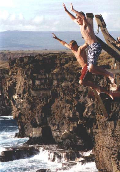 Am "South Point" gibt es diese Klippen, an denen früher Fischerboote herabgelassen wurden, 12 bis 15 Meter weiter unten schäumt der Ozean. Ein paar vielleicht 20-jährige Racker sprangen doch glatt hinunter! Ich hätte ja am liebsten meine Badehose aus dem Auto geholt und es ihnen nachgemacht -- aber plötzlich fiel mir ein, dass ich bald 36 werde: Schon kurz vor dem Greisenalter! So fotografierten wir die Racker nur und kamen uns recht alt vor.