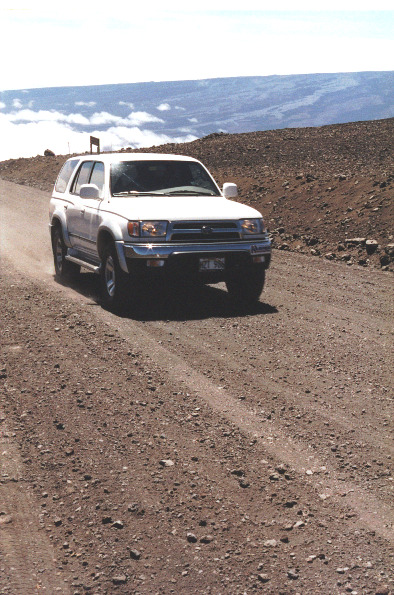Auf einen mittlerweile erloschenen Vulkan mit dem Namen Mauna Kea kann man mit dem Auto hochfahren. Dort hinauf führt nur eine ziemlich steile, ungeteerte Straße und nur eine einzige lokale Autovermietung (Harper) erlaubt es, die Tour mit den von ihr vermieteten "Toyota Four-Runners" (Vierradgetriebene Sport-Utility-Vehicles) in Angriff zu nehmen. Alle anderen in Amerika bekannten Autovermietungen (Dollar, Alamo, Avis) untersagen im Mietvertrag die Benutzung dieser Straße. Was sich als total lächerlich herausstellte, denn die Straße war zwar tatsächlich ungeteert, aber bestens in Schuss, breit wie eine Autobahn und gegen die 3000km australischer Wüste, die wir vor einigen Jahren in einem Landcruiser zurückgelegt haben, ein Klacks. Die Autovermietung knöpfte uns dann noch 22 Dollar pro Tag für eine Vollkasko-Versicherung ab, die eine Selbstbeteiligung von $5000 aufwies. Manchmal spinnen die Amis echt.