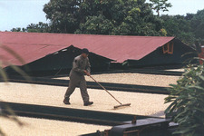 Anschließend entfernt eine altertümliche Maschine ungefähr drei Schichten Schale, so dass kleine Kerne überbleiben, die aussehen wie eine Mischung aus Haselnuss und Haferflocke. Oder ungesalzene Erdnüsse ohne Schale. Diese trocknet man dann und schließlich kommen sie in die Rösterei, die sie anbrutzelt und ihnen den typischen Kaffee-Duft entlockt.