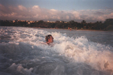An einem Strand brachte ich es fertig, einen Einheimischen versehentlich in einer Welle auszubremsen, weil wir zu nahe beieinander surften. Angelika hat das Ganze vom Strand aus beobachtet und berichtete mir hinterher, der Einheimische habe wütend mit der Faust aufs Wasser geschlagen, während ich schnell das Weite suchte. Was habe ich gelacht, als ich ein paar Minuten später durch einen blöden Zufall beinahe wieder in denselben Menschen hineinrauschte. Zum Glück konnte ich noch rechtzeitig unten in die Welle reinspringen und abtauchen, sonst hätte es einen bösen internationalen Zwischenfall gegeben!