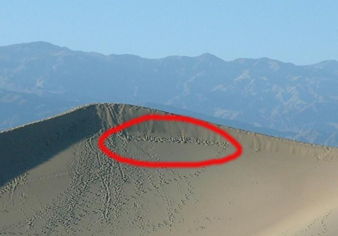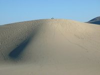 Im Park gibt es noch diese völlig irreale Landschaft mit den Sanddünen. Die hat Ansel Adams übrigens in den 50ern mal mit einem Schwarz-Weiß-Film fotografiert, das ist das Foto, auf dem die Düne wie ein Halbmond aussieht. Wir gingen gleich zweimal dorthin, weil's das erste Mal schon fast zu dunkel war und die Frau Fotografin optimale Lichtverhältnisse forderte. Seht ihr in Abbildung 25 oben auf der Düne den kleinen schwarzen Fleck? Das ist Angelika, die dort oben mit ihrer Fotoausrüstung herumgeschaftelt. Wenn ihr das Bild auf dem Internet durch draufklicken vergrößert, seht ihr Angelika mit zwei Rucksäcken.