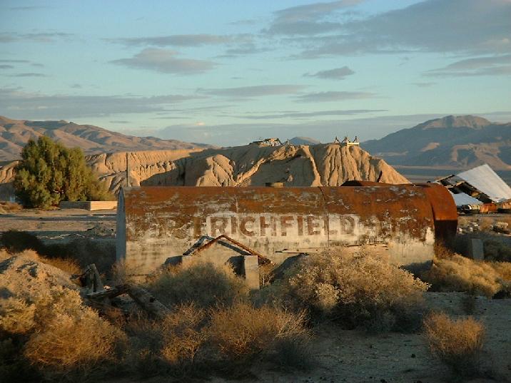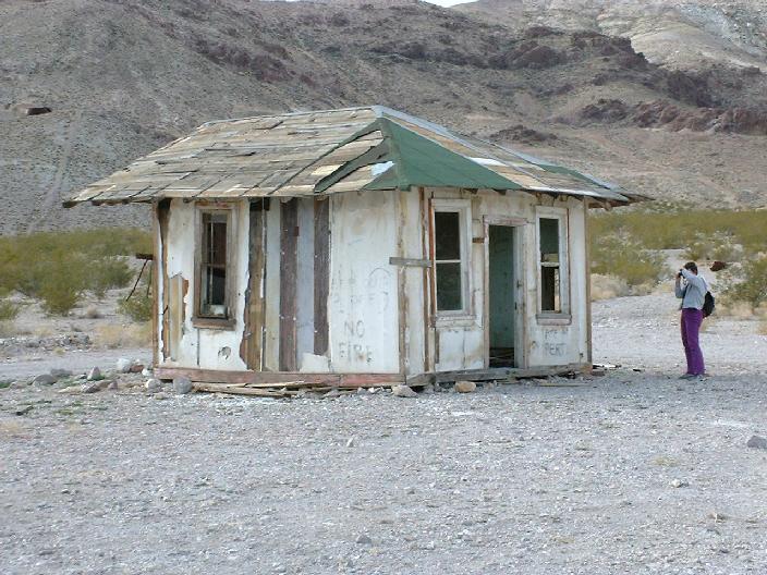 Und noch eine Geisterstadt namens Rhyolite gibt's nahe dem Tal des Todes. Die Geisterstädte sind einfach verlassene Städte, die aufgegeben wurden, nachdem der Grund für die Besiedlung (z.B. Goldrausch) wegfiel -- im Fall von Rhyolite wurde einfach die Borax-Gewinnung unlukrativ und die Leute zerstoben in alle Himmelsrichtungen. Heute sieht man dort vergammelte Autos und 50 Jahre alte verfallene Häuser -- das ist in Amerika schon uralt!