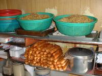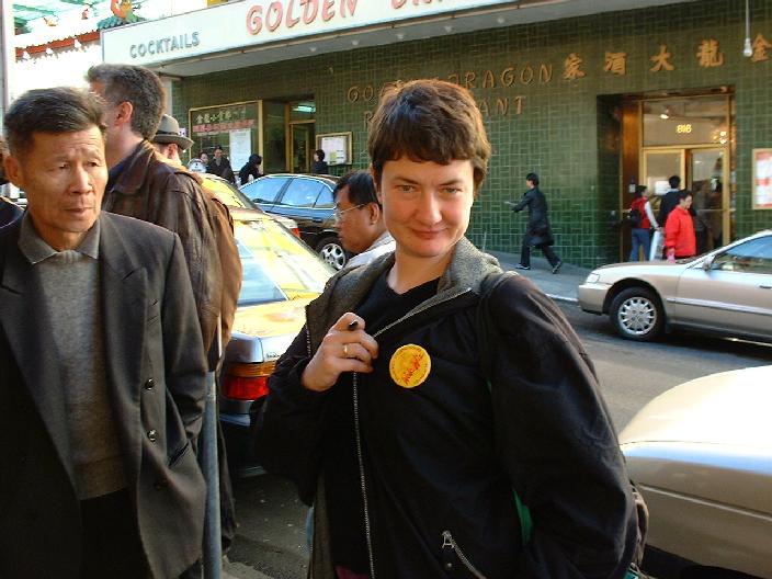 Man trifft sich am Morgen um 9:00 im "Wokwiz" in der Commercial Street 645 in Downtown San Francisco, zahlt den haarsträubenden Preis von $70 pro Person und isst dann praktisch ununterbrochen bis in die frühen Nachmittagsstunden. Wegen der frühen Stunde ging's natürlich mit Frühstück los und nachdem wir uns schon gefragt hatten, ob man in China nicht auch Brot und Marmelade zum Frühstück isst, bekamen wir abschlägigen Bescheid: Es gab aus Reis gefertigte Schleimsuppe mit hautigem Schweinefleisch und schwarzen Batzen drin. Superlecker! Die schwarzen Batzen stellten sich als so genannte "tausendjährige Eier" heraus. Da den Chinesen lange kein Konservierungsmittel bekannt war, nutzten sie folgendes Verfahren, um Enteneier langfristig aufzubewahren: Die mit einer Mischung aus Asche, schwarzem Tee und Zitrone einbalsamierten rohen Eier mit Schale vergruben sie in Blumenerde und holten sie nach ziemlich genau 100 Tagen wieder heraus. "Tausend Jahre alt" ist also schamlos übertrieben, aber das ist wahrscheinlich nur so eine Redensart. Das Eiweiß wird während der Lagerung ganz grau, das Eigelb dunkelgrau-grün. Diese Batzen werden dann als Spezialität mit der Reisschleimsuppe vermixt. Außerdem gab es dazu fritiertes Brot, das so ähnlich wie Donuts (Krapfen) schmeckte. Mal was anderes zum Frühstück! Die anderen Kunden im Lokal (übrigens lauter Asiaten) aßen dasselbe oder schlürften Nudelsuppen.
