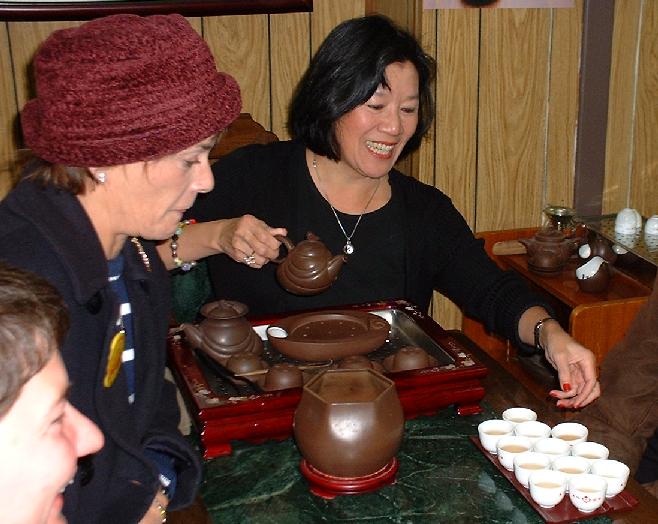 Das ist eine alte Tradition, da setzen sich die Leute zusammen und ratschen und bereiten langsam, langsam den Tee zu. Da wird ein ganz feiner Tee ausgewählt, in ein mikroskopisch kleines Kännchen gefüllt, heißes aber nicht kochendes Wasser draufgegossen, 30 Sekunden ziehen gelassen und der fertige Tee in die Tassen gekippt. "Tassen" ist jetzt übertrieben, die sind gerade mal ein bißchen größer als ein Fingerhut. Und die erste Runde Tee wird nur eingefüllt, um die Tassen zu erwärmen, denn sofort anschließend wird die erste Fuhre weggekippt! Die zweite Fuhre trinkt man dann. Die Tassen haben übrigens keinen Henkel, denn man soll beim Halten der Tasse mit den Fingerspitzen feststellen können, ob der Tee die richtige Trinktemperatur hat und nicht etwa zu heiß ist.