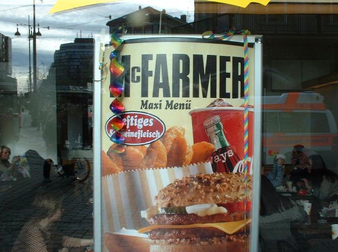 Das Schwierigste war freilich das BSE. Ich hatte schon von Weißwürsten und Leberkäs geträumt und dann konnte ich das alles nicht essen! Na, beim Max gab's exzellente Truthahn-Weißwürste, die wie echte schmeckten. Sogar der McDonald's hat mittlerweile einen Schweinefleischburger namens "McFarmer". Im Lufthansaflugzeug wurde uns "Rindfleisch aus Argentinien" angeboten. In München hab ich deswegen gleich zweimal Schweinsbraten mit Knödeln gegessen, einmal im Unionsbräu und einmal im Forsthaus Wörnbrunn. Ich wollte übrigens noch nachreichen, dass mein Friseur Paolo aus der Friedenheimer Straße in München, bei dem ich natürlich vorbeischaute, den Küchenchef vom "Forsthaus Wörnbrunn", den Andi Geitel, kennt, weil er früher mit ihm Fußball gespielt hat! So schließt sich der Kreis.