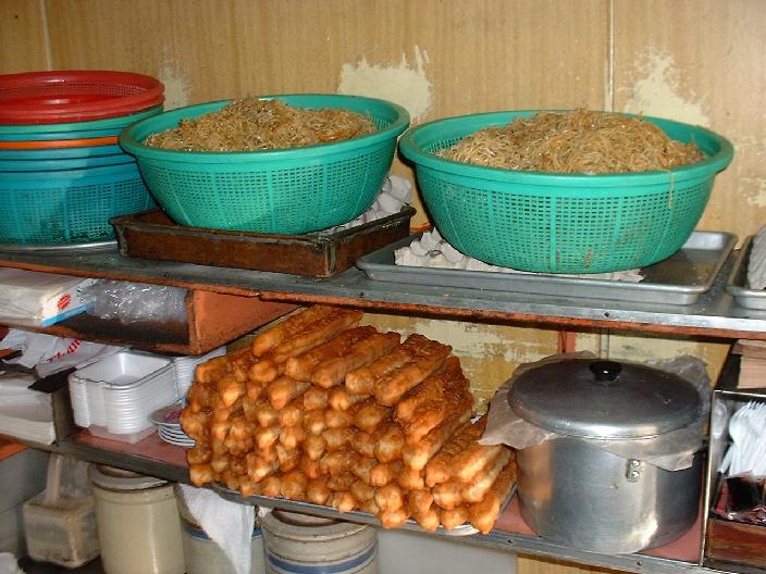 Nächste Station: Dim Sum. Da karren Leute kleine Wägelchen mit allerlei Leckereien an den Tischen vorbei und man muss nur auf die Sachen deuten, schon bekommt man eine Portion auf den Tisch. Diese Form des frühen Mittagessens (neudeutsch: Brunch) wurde von chinesischen Geschäftsleuten etabliert, die für Geschäfte zum Morgentee zusammensaßen und, als es gen Mittag ging, Hunger auf kleine Snacks entwickelten. Angelika und ich machen das öfters am Wochenende, es gibt ein ausgezeichnetes Dim-Sum-Restaurant in San Francisco in der Battery Street, da kommt auf den Wagerln dann alles mögliche vorbei, bis zu Hühnerfüßen, mit Zehen und allem. Die mag ich aber nicht so, weil sie so gummiartig sind. Aber sonst ess' ich alles! Angeblich sollen die Dim-Sum-Läden früher den Preis des Essens nach der Anzahl der auf dem Tisch verbliebenen Teller berechnet haben. Die Saga geht nun, dass es irgendwo ein Dim-Sum-Restaurant an einem Fluss gab und die Gäste einfach heimlich die Teller in den Fluss gleiten ließen, nachdem sie die Leckerbissen verputzt hatten! Heutzutage liegt eine Rechnung auf dem Tisch, auf die die jeweilige Bedienung ein Stempelchen draufmacht oder einen Preis einträgt, wenn man ein Tellerchen vom Wägelchen haben will.