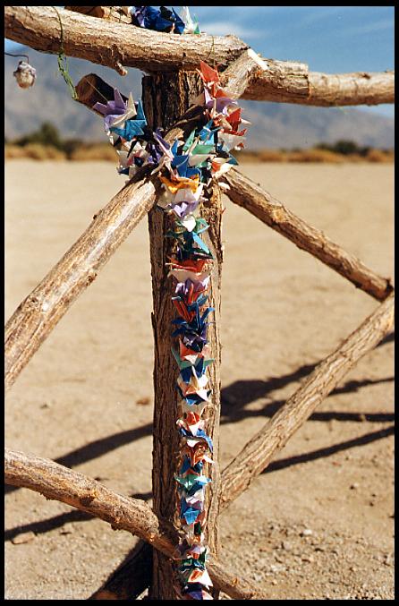 Besucher dürfen mit dem Auto die staubigen Straßen des Lagers abfahren. Und obwohl kaum noch Gebäude zu sehen sind, ahnt der Besucher, was die Internierten hier durchmachten. Holzschilder markieren die Position der Baracken. Sie stehen so dicht beieinander, dass nicht viel Fantasie dazu gehört, sich die Enge vor Augen zu führen. Am Friedhof angekommen, fallen uns die bunten auf Ketten aufgezogenen gefalteten Kraniche auf. Erst später erfahren wir ihre Bedeutung. In Japan herrscht der Glaube, dass wenn man 1000 Kraniche faltet, einem ein Wunsch frei steht, der dann in Erfüllung geht. Heute steht das Symbol der 1000 Kraniche auch für den Friedenwunsch: Nach dem Abwurf der Atombombe auf Hiroshima erkrankte ein japanisches Mädchen mit dem Namen Sadako an Leukämie. Sie begann, Kraniche zu falten, um sich Gesundheit zu wünschen, starb aber, bevor sie die 1000 Kraniche fertigstellen konnte. Daraufhin rief man viele Projekte in ihrem Namen ins Leben, um dauerhaften Frieden in der Welt zu schaffen.