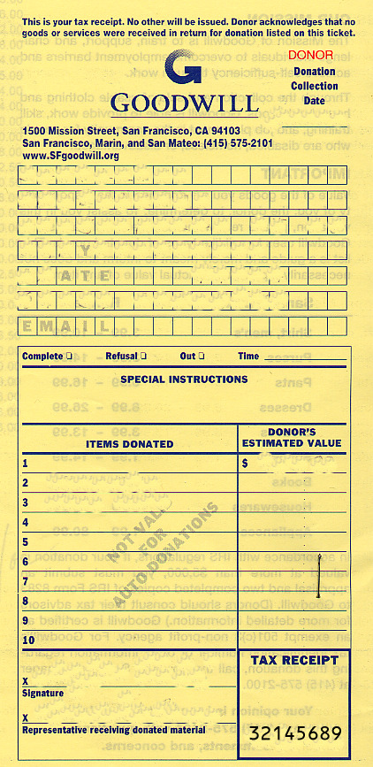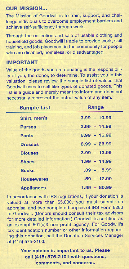 Wichtig ist, dass man die Kleidung zu einer Organisation bringt, die das Finanzamt anerkennt, z.B. Obdachlosenheime, die Salvation Army oder auch Goodwill. Hinter Goodwill verbirgt sich eine riesige, mittlerweile internationale, gemeinnützige Einrichtung mit dem Ziel, Menschen mit Behinderungen oder anderen Benachteiligungen berufliche Perspektiven durch Training und Beschäftgungsmöglichkeiten zu eröffnen. Um dies zu finanzieren, verkauft Goodwill gespendete Kleidung und Haushaltwaren in ihren eigenen Geschäften.