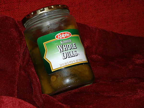 Auch das Wort "kosher" habt ihr vielleicht schon gehört. Immer wenn ich Essiggurken kaufe, wundere ich mich über den "Kosher"-Aufdruck (Abbildung 15). Es bedeutet soviel wie "okay", auf Personen bezogen ("Du, der Typ ist nicht ganz kosher!"), aber meist bezieht es sich auf's Essen: "Kosheres" Essen enthält nur erlaubte Zutaten und wurde nach jüdischen Religionsgeboten zubereitet. Das heißt im allgemeinen: Kein Schweinefleisch. Vor ein paar tausend Jahren war es riskant, Schweinefleisch zu essen (Trichinen), da es wegen der nicht vorhandenen Hygienevorschriften schnell verdarb. Heutzutage essen Juden aus dem gleichen Grund kein Schwein mehr, aus dem Katholiken freitags kein Fleisch essen: Tradition.