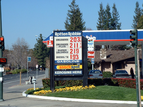 Wegen der Irakkrise dachten sich die Ölfirmen: Erhöhen wir mal die Benzinpreise. Und innerhalb der letzten Monate schnellten die Preise an den Zapfsäulen um sage und schreibe 30% nach oben. Während wir sonst $1.50 pro Gallone unverbleites Normalbenzin zahlten, kostet's mittlerweile selbst bei der Billigtankstelle "Rotten Robbie" in Mountain View $2.03!