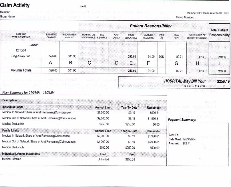 Abbildung 7 zeigt die Rechnung, die danach ins Haus flatterte. Das Krankenhaus hat tatsächlich $526 für die Aufnahmen verlangt. Wahrscheinlich war die Röntgenkamera aus Gold. In Spalte B seht ihr, dass die Versicherung aber vorher mit dem Krankenhaus für Röntgenaufnahmen des Knöchels ein Maximum von $341.90 ausgekartelt hat, und das ist die Summe, die das Krankenhaus kriegt. Wäre ich nicht versichert, hätte mir das Krankenhaus eiskalt $526 abgeknöpft. In Spalte E seht ihr die Selbstbeteilung von $250, die euer Erzähler leider selbst berappen musste. Von den $341.90 bleiben also $91.90, von denen die Krankenkasse 90% erstattet, und beim lieben Michael bleiben nochmal $9.19. Also haben wir einen Scheck über $259.19 ans Krankenhaus geschickt und die Sache war erledigt. Aetna ist eine der besseren Versicherungen und es gab keine Komplikationen. Na, das war eine teure Formel-1-Kurvenlage!