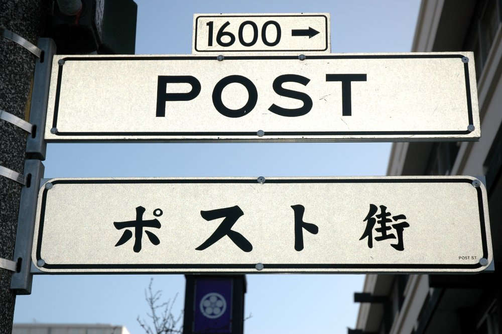 In Abbildung 1 seht ihr, dass die Straßennamen in Japantown zweisprachig ausgeschildert sind: Oben steht "POST", was in Amerika typisch ist, denn das Wort für Straße ("Street") steht, anders als in Deutschland, nie auf dem Schild. Ist ja irgendwie klar, dass es eine Straße ist. Der Amerikaner mag keine sinnlose Redundanz. Die kleine Tafel mit "1600" und dem Pfeil nach rechts deutet an, dass rechts vom Schild die Hausnummern ab 1600 beginnen. Links davon sind sie kleiner.