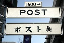 Darunter steht das japanische Schild. Darauf stehen vier japanische Schriftzeichen. Die linken drei sind "Katakana"-Zeichen, die dazu benutzt werden, auf japanisch ausländische Worte zu lautmalen. Die ersten drei Zeichen werden "Po-Su-To" ausgesprochen. Da Japaner keine harten Konsonanten ohne Vokale kennen, ist "Post" nicht ganz einfach auszusprechen. Deswegen werden an das "S" und das "T" in "Post" ganz einfach Vokale angehängt, denn "Su" und "To" sind gängige japanische Silben. Um das nochmal klarzustellen: Die drei Katakana-Zeichen bedeuten keineswegs "Post" auf japanisch. Sie lautmalen nur das englische Wort, das klingt zwar etwas merkwürdig, aber so reden Japaner englisch. Übrigens sagen waschechte Japaner zu "Yahoo!" immer "Yafoo!", denn den Laut "H" gibt es im Japanischen, wie auch im Französischen nicht. Das vierte Zeichen auf dem oberen Schild ist ein Kanjii-Zeichen, das "Straße" symbolisiert. Wenn ihr mal in einer Quiz-Show eingeladen seid, könnt ihr damit protzen, dass ihr wisst, dass alle japanischen Kanjii-Zeichen identisch mit den chinesischen Schriftzeichen sind, aber in China anders ausgesprochen werden.