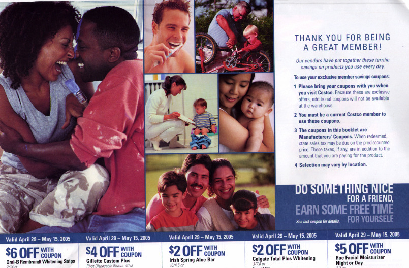 Michael: Wenn ein Konzern in einer Stadt wie San Francisco Werbung betreibt, muss er genau aufpassen, dass er auch alle Bevölkerungsgruppen gleichwertig behandelt. Da in der kunterbunten Stadt 44% Weiße, 31% Asiaten, 14% Latinos und 8% Schwarze leben (Quelle: San Francisco demographic profile), wäre es unrealistisch, auf einem Werbeplakat für Unterhosen zum Beispiel nur weiße Models zu zeigen. In Abbildung 5 seht ihr zum Beispiel, dass auf der Titelseite eines ins Haus geflatterten Coupon-Heftes so ziemlich alle maßgeblichen Bevölkerungsgruppen vertreten sind: Das turtelnde Pärchen links ist schwarz, der Herr mit der schäumenden Zahnbürste weiß, der Opa mit dem Fahrrad weiß und alt, die Mama in weiß und in der Mitte offensichtlich berufstätig (wegen der weißen Kleidung offensichtlich Ärztin), die Dame mit dem Baby mitte rechts Asiatin, und die strahlende Familie unten links sind Latinos. Und auch der Sportartikelkatalog in Abbildung 6 spiegelt alle maßgeblichen Bevölkerungsgruppen wider.