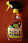 "Goo" ist das amerikanische Wort für eine hartnäckig klebene Masse. Wenn man zum Beispiel eine Badewanne trotz regelmäßigen Gebrauchs nicht reinigt, setzt sich am Boden nach einer Weile so eine zähe Masse ab. Übersetzen kann man "Goo" vielleicht am besten mit dem bayerischen "Baaz". Und "Gone" heißt "verschwunden", so dass "Goo Gone" soviel wie "Baaz verschwunden" heißt. "Goo Gone" kommt in einer praktischen Sprühflasche, lässt sich leicht auftragen und riecht angenehm nach einer Mischung aus Mandarine und Marzipan.