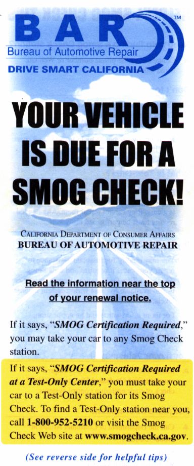 Zum "Smog-Test-Only" wird man nur eingeladen, falls man ein Fahrzeug fährt, das a) schon mal beim Smog-Check durchgefallen ist oder b) vom Typ her als nicht gerade umweltfreundlich bekannt ist. Und dann gibt's noch eine Lotterie, in der man c) die Arschkarte zieht und vom DMV zufällig ausgewählt wird. Detaillierte Erklärungen und Tips gibt's unter http://www.smogtips.com.
