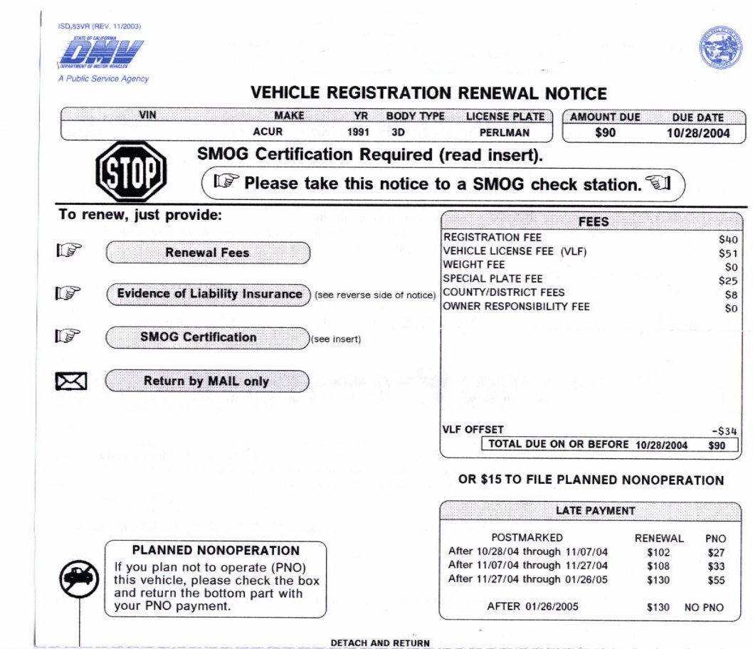 Einmal im Jahr kommt in Kalifornien von der Kraftfahrzeugmeldebehörde DMV ein Wisch ins Haus geflattert, der dazu auffordert, die jährlich fällige Registrierungsgebühr zu zahlen und einen Nachweis über die Haftpflicht-Versicherung des Fahrzeugs beizubringen. Abbildung 11 zeigt unseren Bescheid.