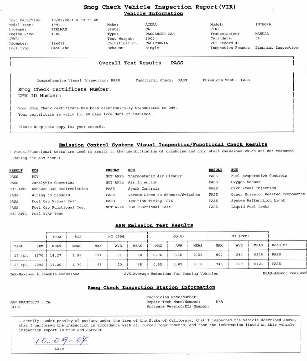 Neuere Autos werden übrigens am Computer angedockt und der Smog-Test- Computer zapft Werte davon ab. Ein Arbeitskollege musste übrigens einmal für über $1200 einen neuen Computer in seinen perfekt funktionierenden BMW M3 einbauen lassen, weil dessen Smog-Test- Schnittstelle kaputt war. Sonst wäre er nicht durch den Smog-Test gekommen, ein Wahnsinn! Zum Glück hat PERLMAN noch keinen Computer. Aber ein Zertifikat über die bestandende Smog-Prüfung hat er dennoch bekommen wie Abbildung 14 zeigt. Mit Bravour bestanden!
