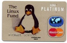 Obwohl jeder denkt, dass es unzählige Firmen gibt, die Kreditkarten anbieten, dominieren die fünf größten, nämlich JPMorgan Chase, American Express, MBNA, Bank of America und die Citigroup -- laut dem Consumer-Reports-Heft im November 2005 -- 65% des Marktes. Die Kreditkarten kommen natürlich trotzdem in zig verschiedenen Aufmachungen daher. Michael liebt besonders die Karten, die irgendwelche Bonusprogramme haben, wie zum Beispiel, dass wir am Ende des Jahres 2% auf bestimmte Einkäufe wieder bekommen oder er E-Bay- Punkte sammeln kann, wenn er die Karte benutzt. Am meisten Aufsehen erregen wir aber immer mit unser Linux-Mastercard (übrigens von MBNA), die den Pinguin von Linux auf der Karte abbildet. Alle kommentieren immer, wie nett der aussieht, wissen aber in der Regel nicht, dass sich hinter Linux Michaels Lieblingsbetriebssystem für den Computer verbirgt.